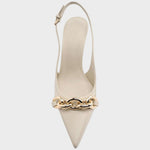 Los Valéria son el equilibrio ideal entre sofisticación y actitud. Con punta fina y tacón medio, este modelo slingback en tono neutro se realza con una cadena metálica frontal que le añade un toque moderno y refinado. Un clásico reinventado para mujeres que no renuncian al estilo y la comodidad.